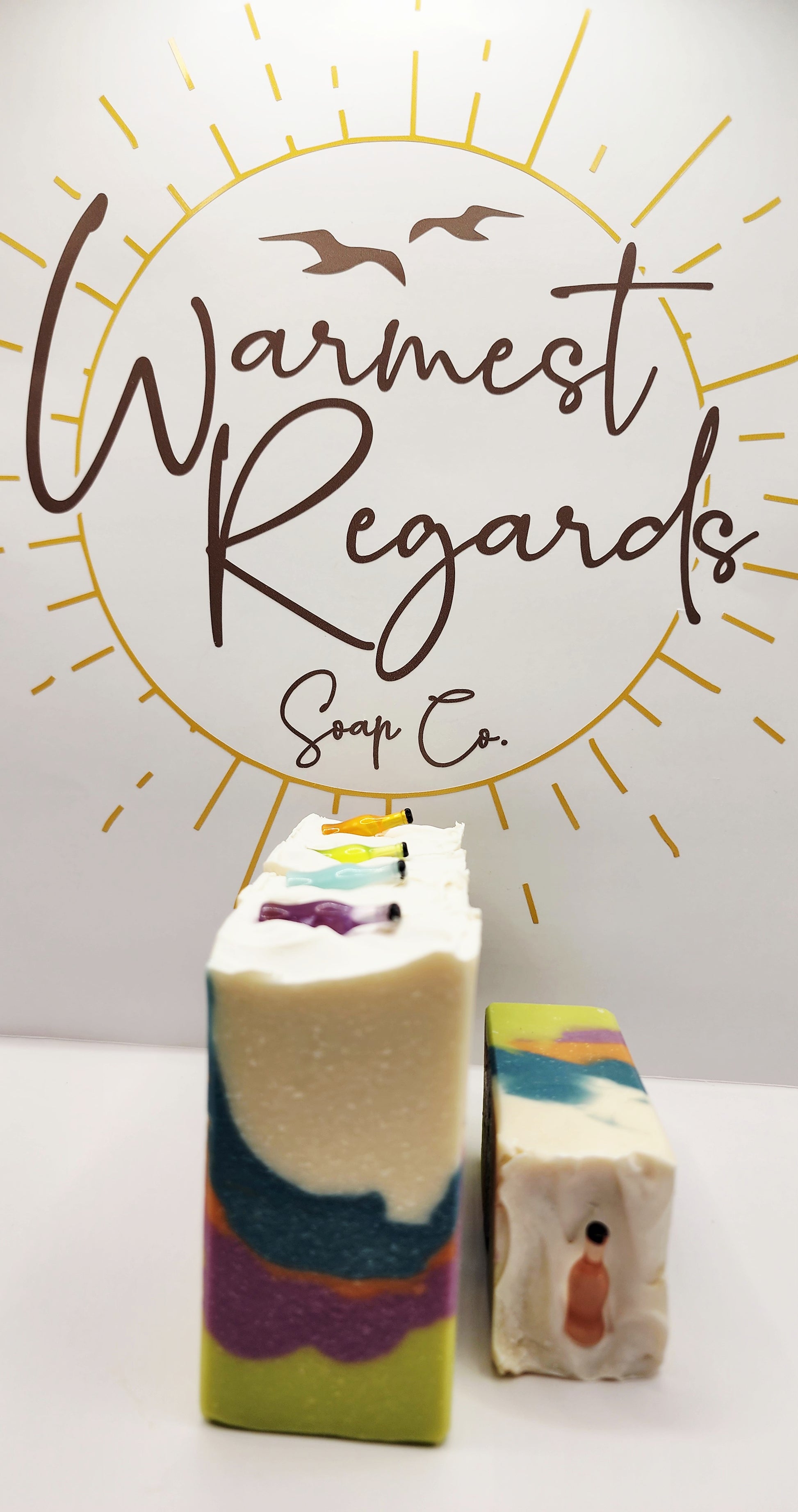 Ingredients: Olive Oil, Palm Oil, Coconut Oil, Castor Oil, Distilled Water, Dendritic Salt, Lye, Mica, Titanium Dioxide, Kaolin Clay, Colloidal Oatmeal, Clay Embed,